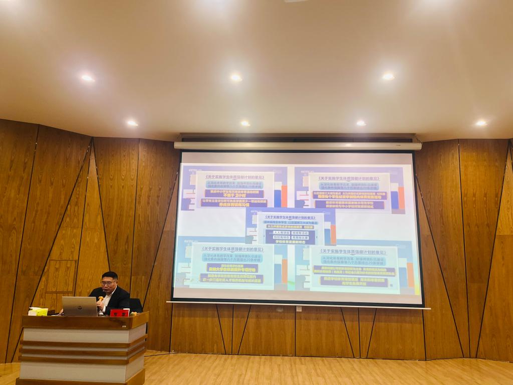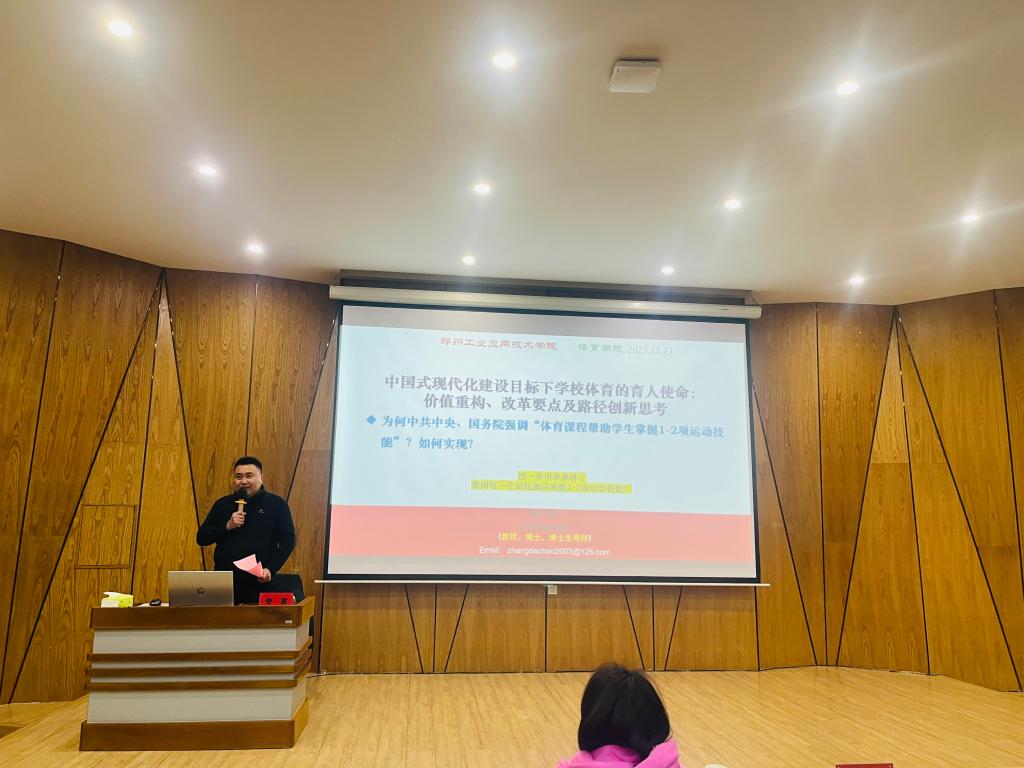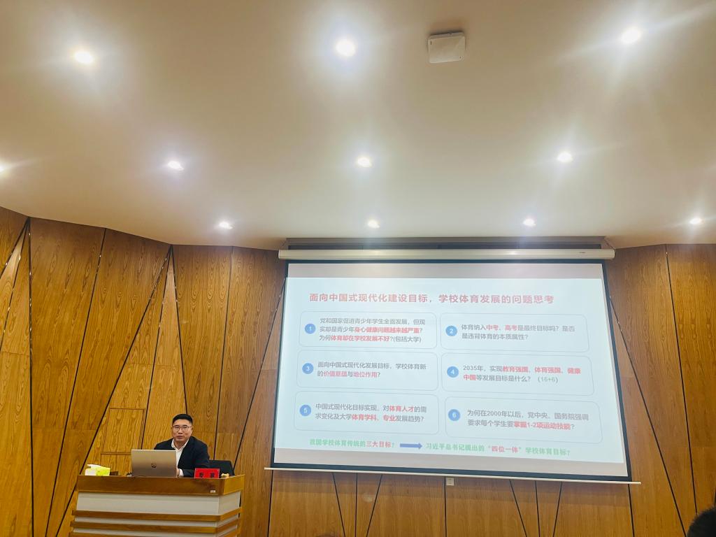 (文/卢佳 图/王保停)12月23日下午,全国体育新苗奖获得者、河南体育学院院长张大超教授应邀为我院师生作了题为“中国式现代化建设目标下学校体育的育人使命:价值重构、改革要点及路径创新思考”的学术报告。本次报告由副校长、体育学院院长刘山玉主持,体育学院院长杨建国、教学科研副院长王金瑞及全体教师和120余名学生聆听了报告。