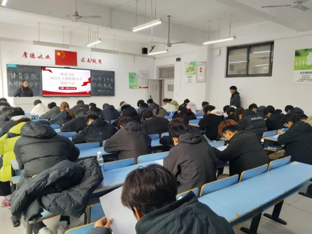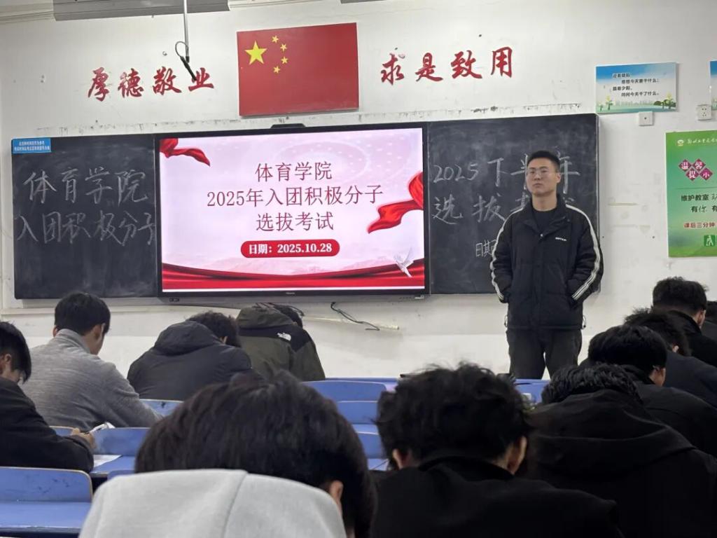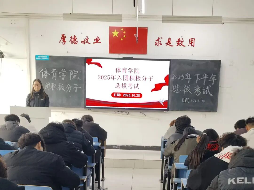 (图/刑新华 文/薛娅妮)为扎实推进共青团组织建设,为团组织吸纳新鲜血液,切实检验入团积极分子的理论学习成果与思想觉悟,10月28日,体育学院2025年下半年入团积极分子选拔考试在文化楼1-101、1-105教室顺利举行。本次考试由学院团委统筹组织,薛亚妮、杨齐广两位老师共同担任监考工作。