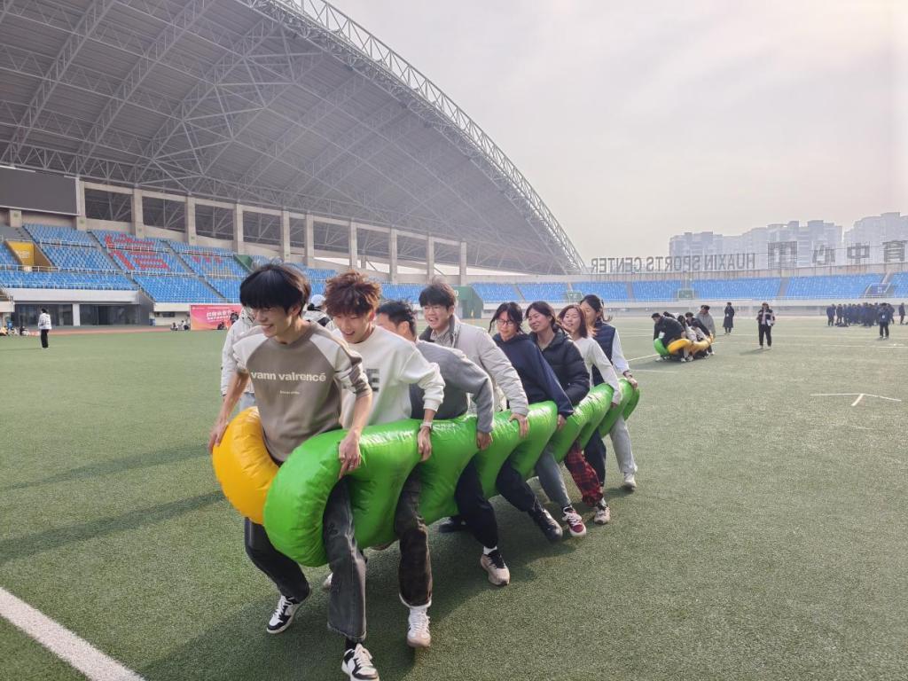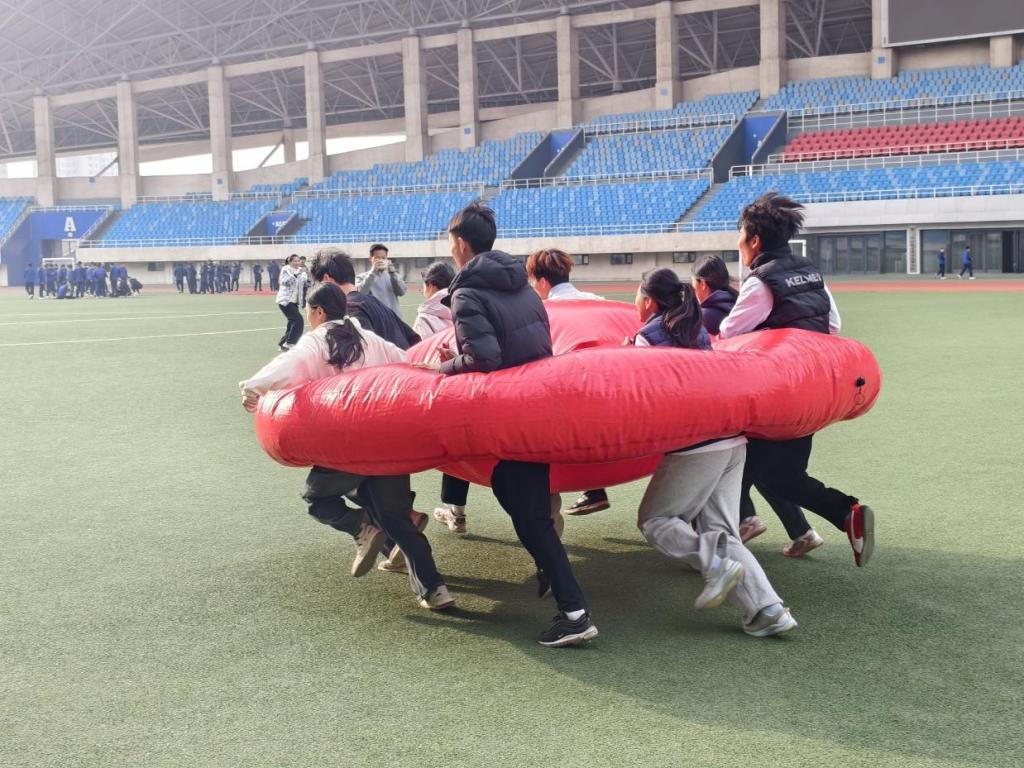 本次体育节趣味赛事紧扣“趣味同行、聚力争先”核心主题,精心设置“步调一致”“无敌风火轮”“魔毯蹦蹦”等特色项目,既重团队协作又富竞技趣味,有效淡化了传统赛事的紧张感,让学子们在欢乐中感受运动魅力。随着裁判一声令下,各项目赛场同步开赛、精彩纷呈,青春活力在操场上尽情绽放。“无敌风火轮”赛场,队员们分工协作搭建履带,比赛时喊着整齐口号稳步前行,即便履带偶有破损,也能迅速抢修、携手共进,每一步都彰显着团队凝聚力。“魔毯蹦蹦”赛场氛围更是热闹非凡,队员们站在魔毯上同步跳跃前进,跳跃声、欢呼声交织成悦耳的青春乐章。五大项目各具特色,让学子们在趣味竞技中释放活力、收获成长。